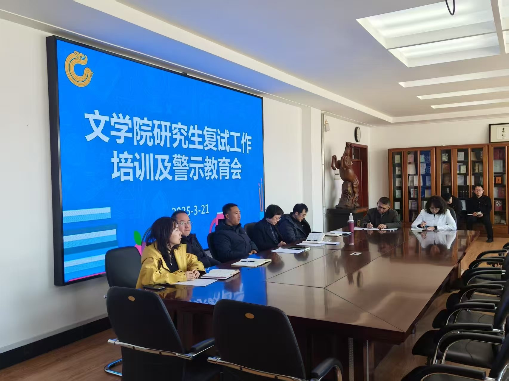 党委书记孙忠权、院长洪飏、党委副书记兼纪委书记辛升学、副院长王虎、副院长武兆雨出席会议,全体参与复试工作的教师和工作人员参加了会议。