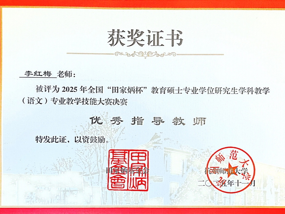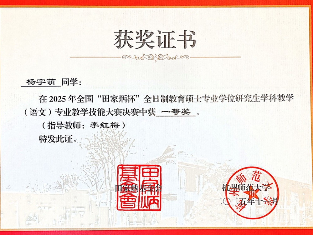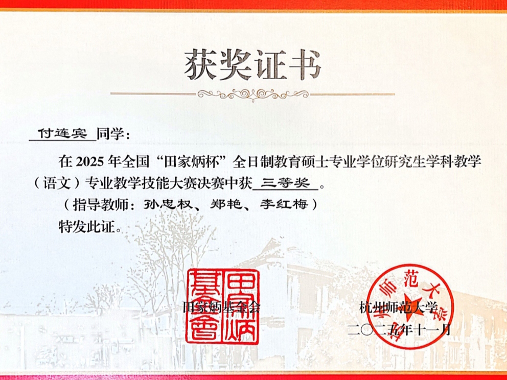 2024级学科教学(语文)专业研究生杨宇萌、付连宾凭借扎实的专业功底和出色的赛场表现脱颖而出,分别荣获国家级一等奖、三等奖,李红梅老师获评“优秀指导教师”称号。