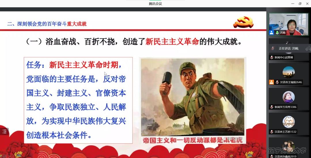 洪飏院长从总结党的百年奋斗重大成就和历史经验的重要意义,深刻领会党的百年奋斗重大成就、历史意义、历史经验,在新时代新征程上赢得更加伟大的胜利和荣光五个方面带领同学们一起学习了解党的十九届六中全会精神。她寄语同学们,作为新时代的青年,要更加紧密地团结在以习近平同志为核心的党中央周围,大力弘扬伟大建党精神,以史为鉴,开创未来。相信在中国共产党和中国人民的努力奋斗下,党和国家必将在新时代新征程上赢得更加伟大的胜利和荣光!