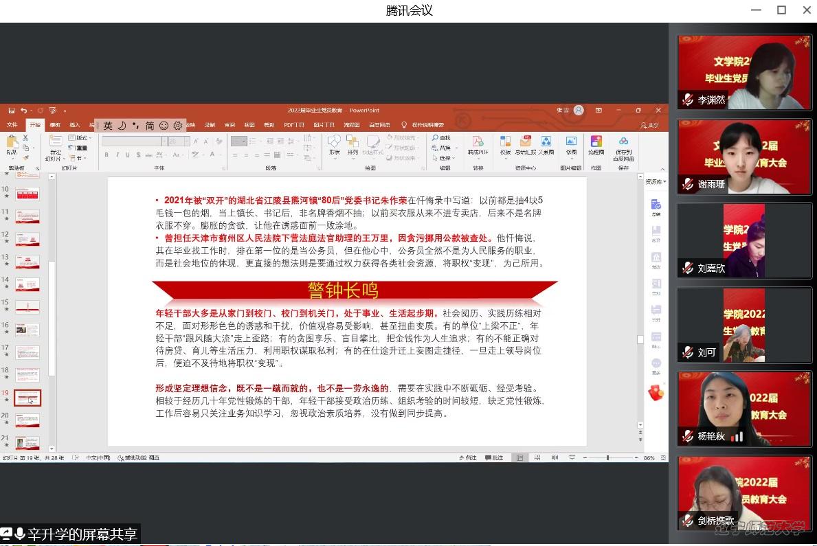 辛升学书记结合近期全国纪检监察系统查处的多起“80”“90”“95”后年轻干部违规违纪案例,向毕业生党员们表达了开展“关口前移”党规党纪教育的深刻初衷和必要意义。他指出,造成违纪干部年轻化现象的原因主要是有些年轻干部理想信念不坚定,精神上爱慕虚荣,缺乏应有的自律意识和自制能力,世界观、人生观、价值观严重错位,最终拒腐防变堤坝瓦解。因此,广大毕业生党员需要时刻给自己敲响警钟,要深知形成坚定的理想信念并不是一蹴而就、一劳永逸的,因此走向工作岗位后,党员同学们也应该将党性的修养和业务知识的修炼同步进行。