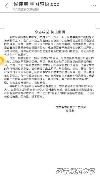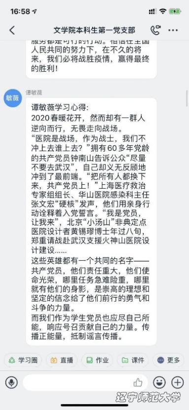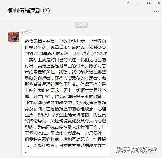 文学党支部王桂荣老师谈到:“这次疫情,首先让我感受到的是中国共产党的伟大,总书记讲话让我倍受鼓舞,相信在英明的党中央领导下,一定会战胜疫情!其次是感受到我们这个民族是一个有凝聚力、不屈不挠的民族!一方有难、八方支援,构筑群防群治的严密防线,这种民族精神、民族自信心和凝聚力十分宝贵。面对磨难方显英雄本色,以钟南山院士为代表的医务工作者的英雄事迹感染着我们,他们是我们这个民族的骄傲!我们要向英雄人物学习,在自己的平凡岗位上坚守,搞好教学与科研工作,发挥党员的先锋模范带头作用,共克难关,战胜疫情!”