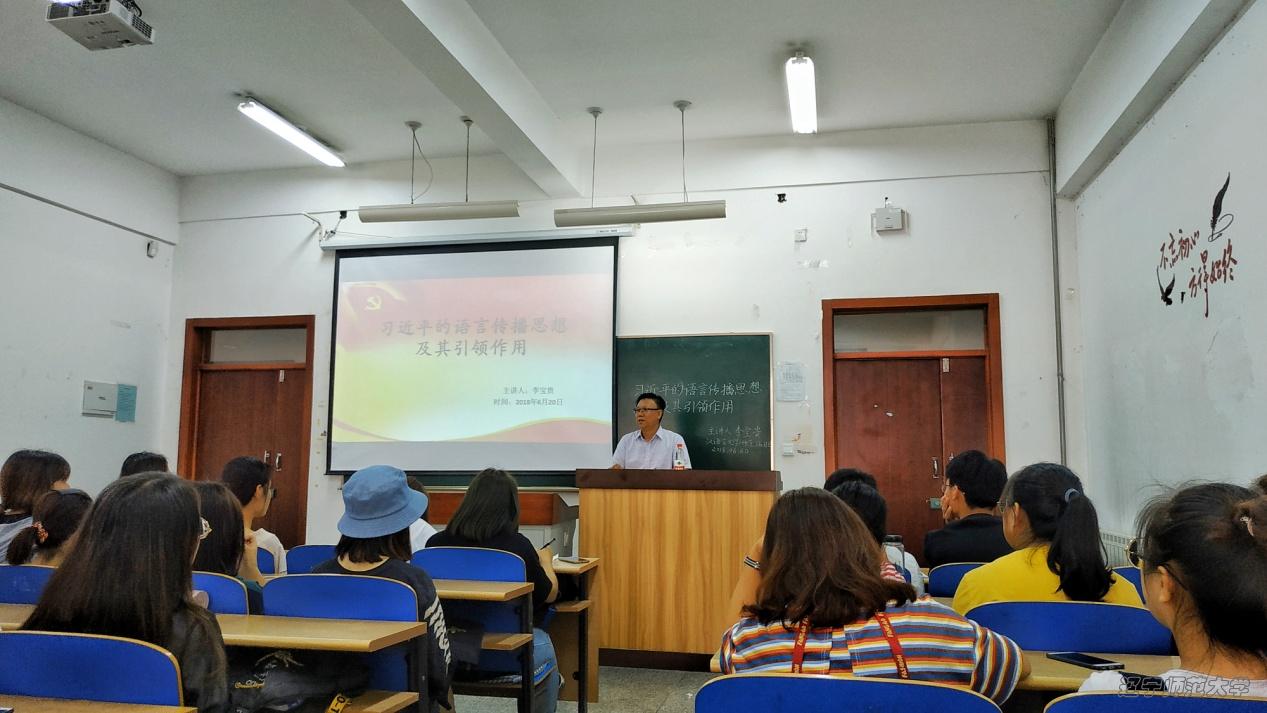 李宝贵主任在课上对习近平语言传播思想的引领作用进行了高度概括,其特点分为三方面:一是理论高度与实践深度相结合,二是主体供给和受众需求的统一,三是传播时效率的统一。最后李主任对大学生建设汉语言文化提出了殷切希望,希望学生党员们能够为汉语文化传播贡献一份力量。