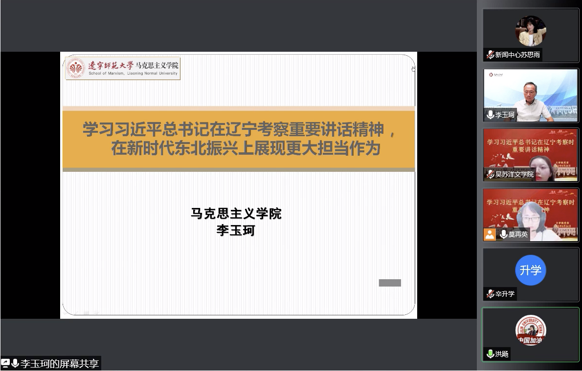 李玉珂教授从高站位、深谋划、实落点三个角度出发,从习近平总书记在辽宁考察的基本情况、深刻领会习近平总书记辽宁考察重要讲话的意义及学习习近平总书记重要讲话,奋力开创辽宁振兴发展新局面三个方面展开讲解。