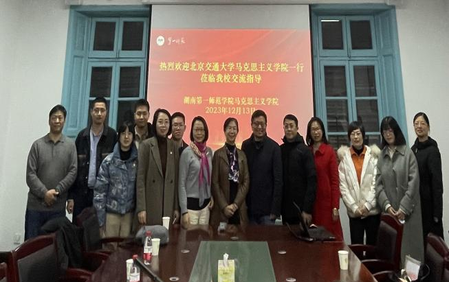 13日上午,各位成员又参观了湖南第一师范学院(城南书院校区),青年毛泽东曾在此求学、任教。支部成员详细了解城南书院的发展、第一师范的历史和青年毛泽东在此学习和工作的情况,“恰同学少年,风华正茂,书生意气,挥斥方遒,指点江山,激扬文字,粪土当年万户侯”。参观结束后,一行人与湖南第一师范学院马克思主义学院的领导和老师进行了深入交流,学院书记阮东彪详细介绍了一师马院的发展建设情况,并与王竹苗副院长、胡慧娥副院长和各教研室主任交流毛泽东思想和中国特色社会主义理论体系概论、习近平新时代中国特色社会主义思想、形势政策课、社会实践课的开设、运行情况。其中,一师的“重走主席游学路”的社会实践设计给大家留下深刻印象。双方明确日后要加强交流,互通有无,充分利用好红色资源开展思政课教学。