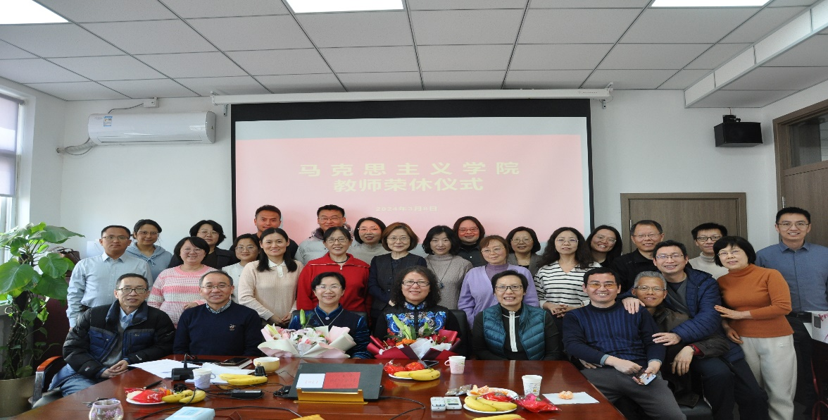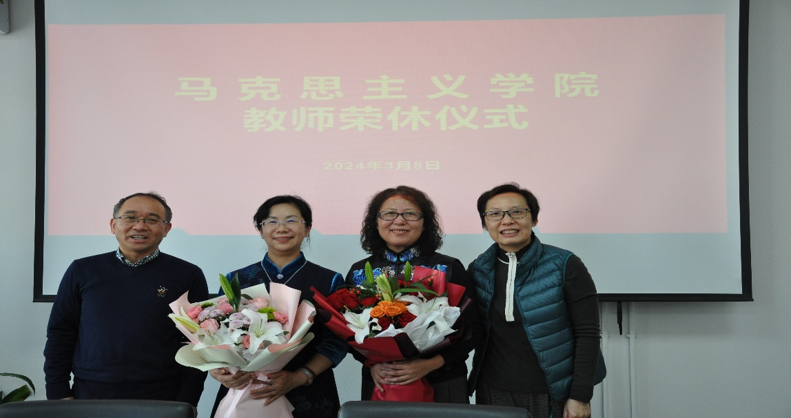 2024年3月8日上午,马克思主义学院在向阳办公区2207会议室为杨蔚、翟媛丽两位教师举行荣休仪式。学院党委书记孙冬梅、院长高正礼、学院副书记、副院长田永静、副院长闫长丽、副院长郑士鹏和学院各教研部30余名教师参加本次活动。副院长郑士鹏主持本次荣休仪式。