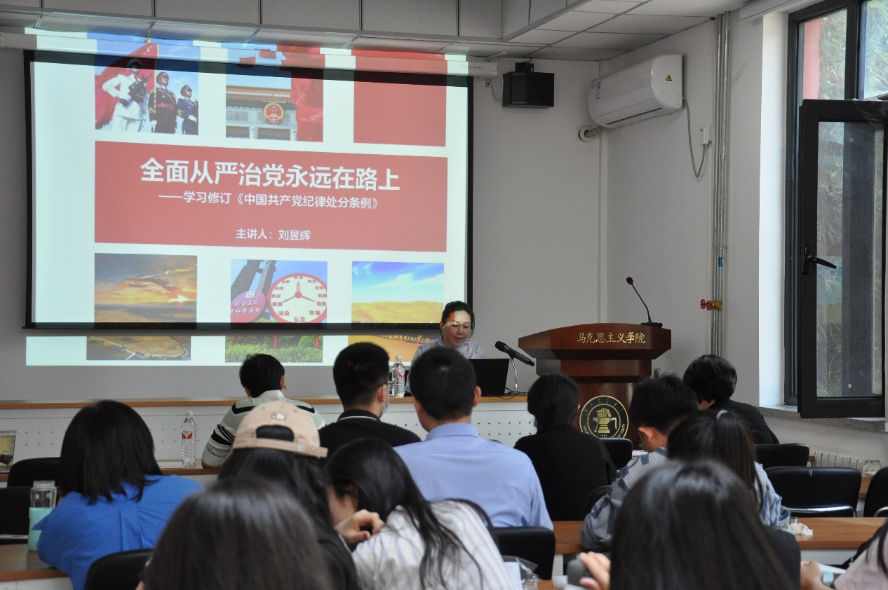 2024年5月15日,马克思主义学院邀请中国政法大学马克思主义学院研究党内法律法规方向的刘昱辉老师作题为《全面从严治党永远在路上》专题讲座,对最新修订的《中国共产党纪律处分条例》进行解读,学院党委书记孙冬梅、副书记副院长田永静、师生党支部书记、纪律委员和学生传习所宣讲团成员参加学习。