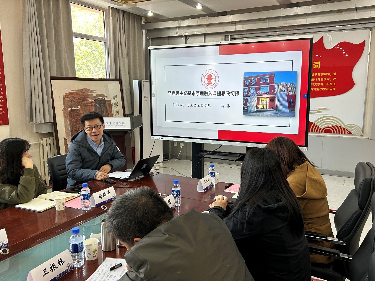 马克思主义学院马克思主义基本原理教研部党支部书记赵伟分享了对如何把马克思主义基本原理有机融入专业课、更好地开展课程思政的思考。他首先提出要坚持以马克思主义为指导,深入挖掘其中蕴含的思政教育元素从而实现课程思政与思政课程的深度协同,然后具体从科技作用、科技伦理、人工智能和科技异化4个方面详细讲解了马克思主义基本原理融入课程思政的探索与实践。