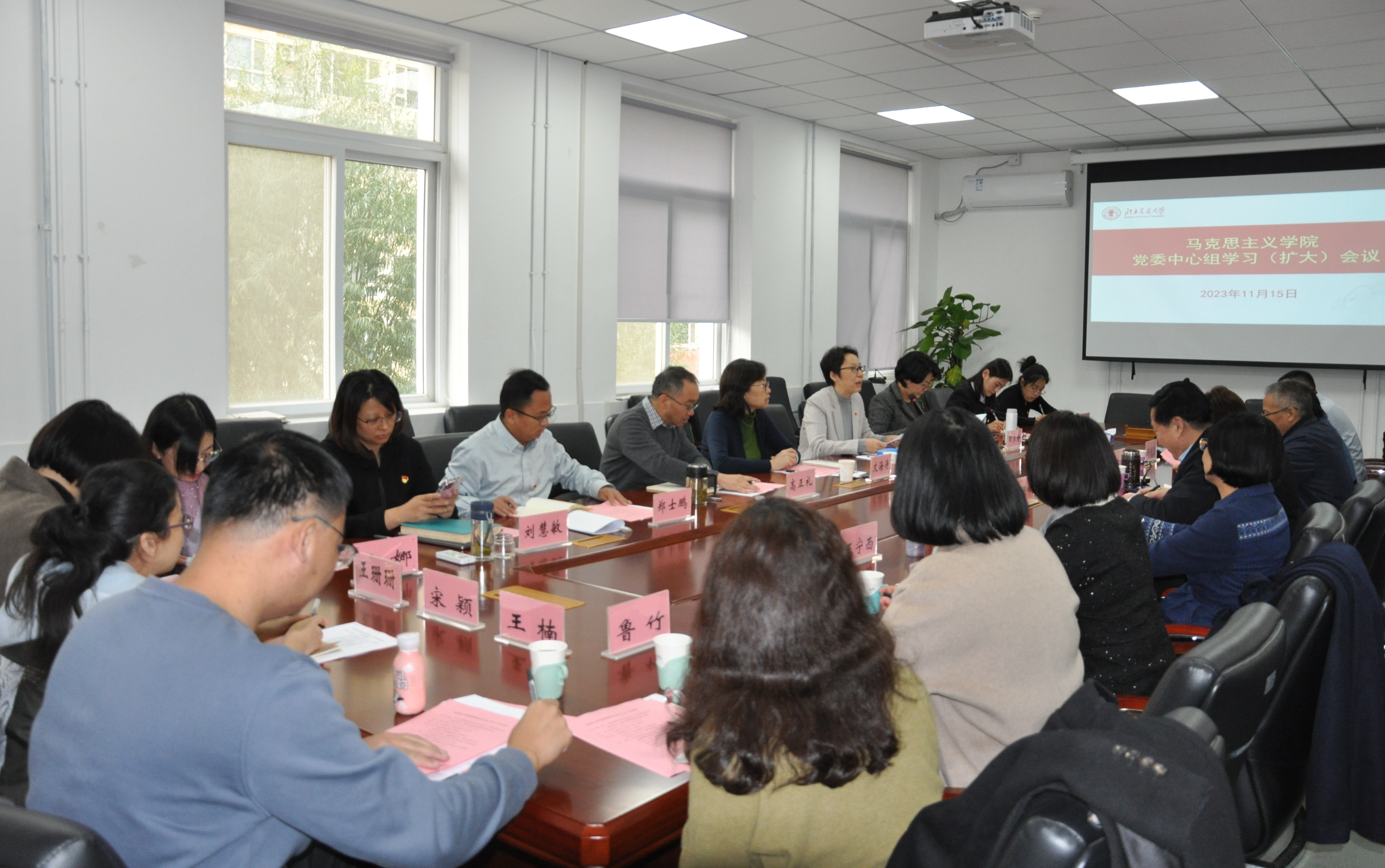 11月15日下午,马克思主义学院举行党委理论中心组学习(扩大)会议,本次学习主题为“学习教育部《普通高等学校马克思主义学院建设标准(2023版)》、推进学院高质量内涵式发展”,校党委副书记文海涛对本次学习进行巡听督导。除学院党委委员之外,学院各学位点负责人、教研部主任及教师党支部书记共同参加学习。