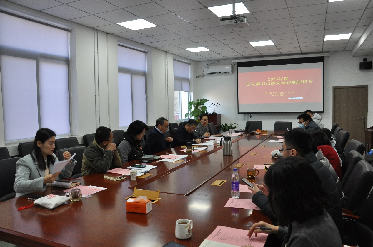 按照《2023年度马克思主义学院党支部书记抓党建述职评议考核工作通知》的相关要求,6位教职工党支部书记依次进行述职汇报,汇报内容紧紧围绕学习贯彻习近平新时代中国特色社会主义思想、落实学校、学院党委决策部署、抓思想政治教育举措及成效、在教学科研管理等工作中发挥战斗堡垒作用、加强党员发展和教育管理、抓“三会一课”制度、组织生活、党支部品牌创建和实践成果等情况。