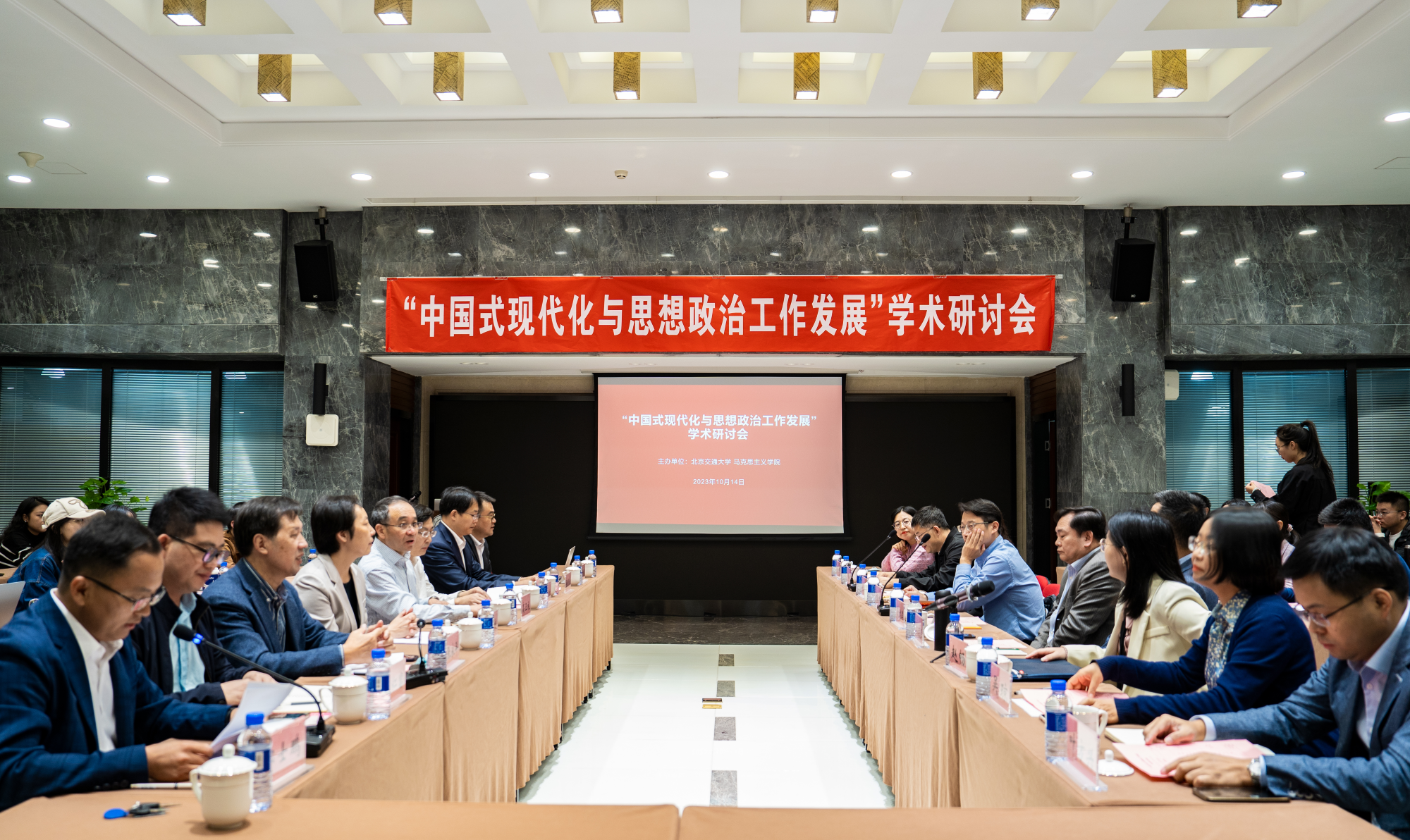 为深入学习贯彻习近平新时代中国特色社会主义思想和党的二十大精神,推进对中国式现代化的宣传阐释,贯彻落实《关于新时代加强和改进思想政治工作的意见》,2023年10月14日,北京交通大学马克思主义学院举办了“中国式现代化与思想政治工作发展”学术研讨会。来自北京师范大学、武汉大学、华中师范大学、北京理工大学、复旦大学、天津大学、中央财经大学、对外经济贸易大学、北京交通大学等高校和科研机构的近百名专家和学者参加了会议。
